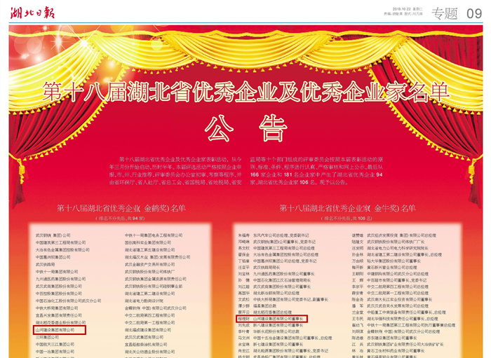 山河集团位列湖北百强企业25位并荣获“金鹤奖”