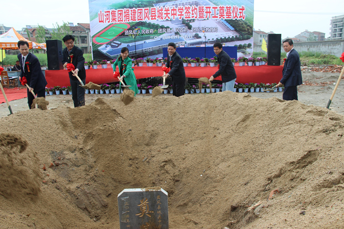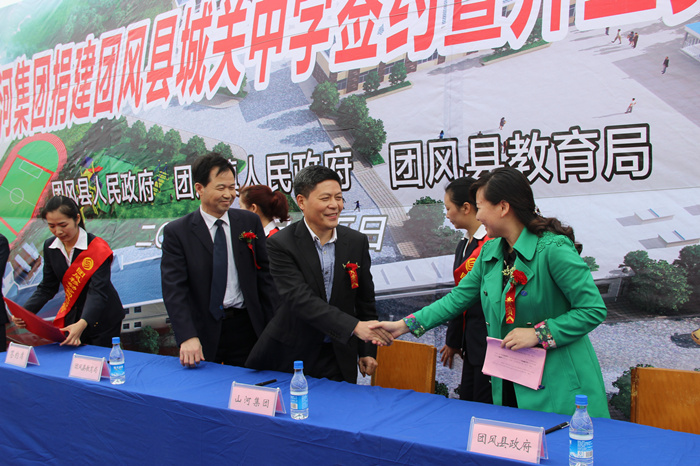 4月15日上午,山河集团捐建团风县城关中学签约暨奠基开工仪式举行,团风县副县长黄菊花代表县人民政府与山河集团董事长程理财签订了捐建协议书。