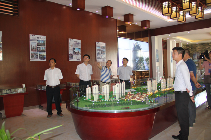程董事长及董事长助理、投资事业部总经理姚伟一行在湖南公司总经理林江的陪同下首先来到了位于犀城广场东北角的“江南熙元”售楼部。在仔细询问了一期项目的产品类别及销售进度等情况后,董事长指出,在县级城市开发楼盘一定要结合当地实情,为客户提供满意的产品,同时树立行业的标杆。