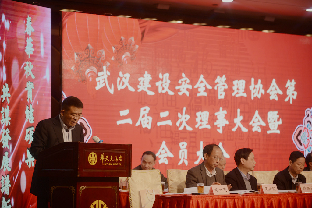 武汉市建筑安全协会副会长、山河集团常务副总经理林中茂主持会议。武汉市建委副主任夏平,市民政局处长张福先,市建委质安处处长谢卫华,市安全监管站站长熊付刚、书记王伟震、副站长周捍东,市安全协会应志刚等领导及在汉建筑施工单位参会代表共计400余人参加此次会议。