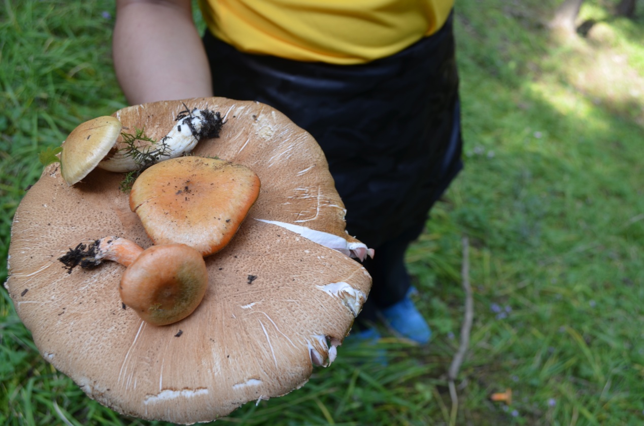 看,我们的员工,在山间采了一颗这么大的蘑菇,这是收获的号角,这是希望的预言!