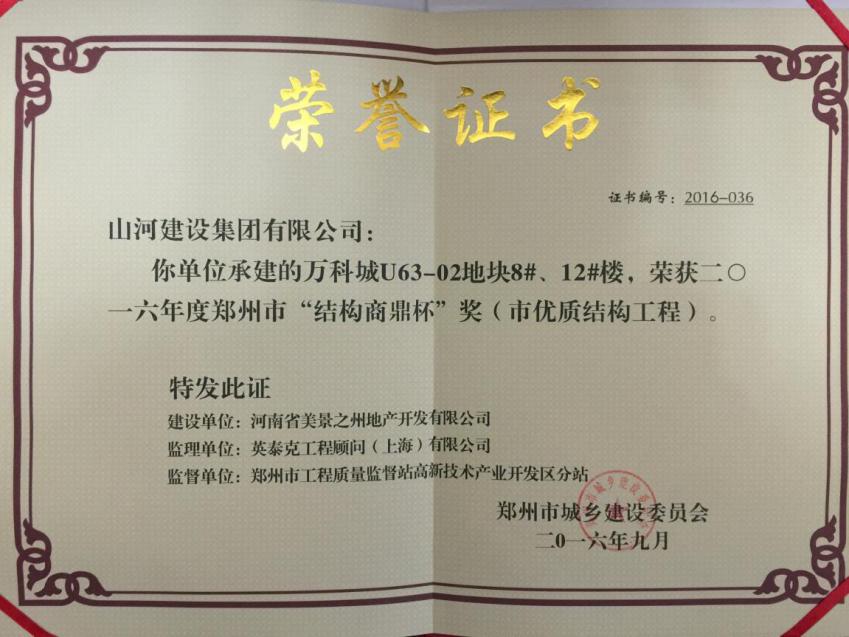 近日,从郑州市城乡建设委员会再次传来喜讯,山河集团河南公司承建的万科城U63-02地块的8#、12#楼荣获2016年度郑州市“结构商鼎杯”(市优质结构工程)奖。这是该项目继2016年3月获得“郑州市建筑施工安全生产标准化示范项目”后,再获殊荣。