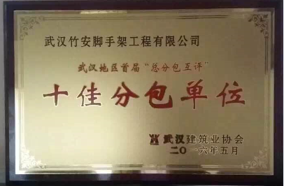 今日,武汉建筑业协会组织的武汉地区首届总分包互评活动在光谷金盾大酒店举行颁奖仪式,武汉竹安设备管理有限公司及控股子公司武汉竹安脚手架工程有限公司以其雄厚的技术实力和良好的声誉,双 双获评“十佳分包单位”。