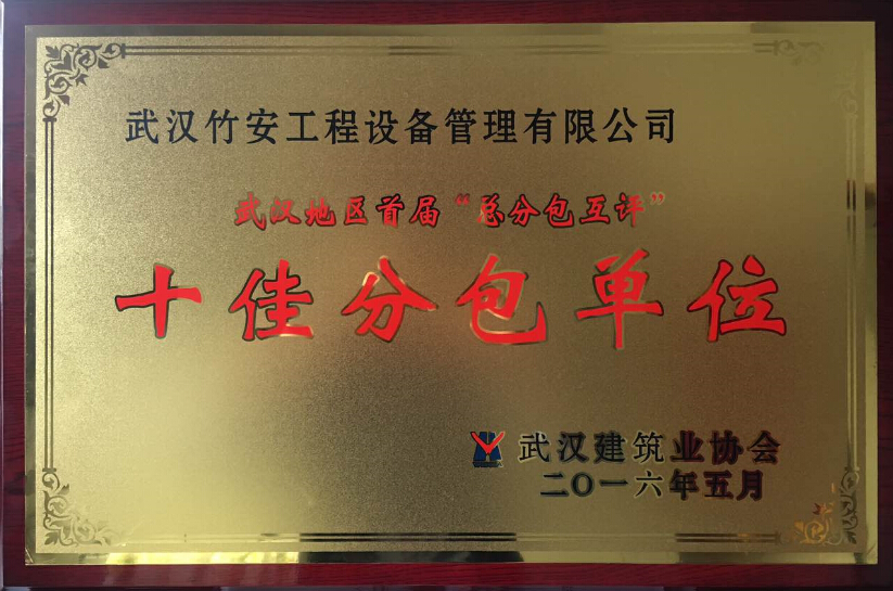 [竹安设备]竹安公司荣获武汉地区首届总分包互评“十佳分包单位”