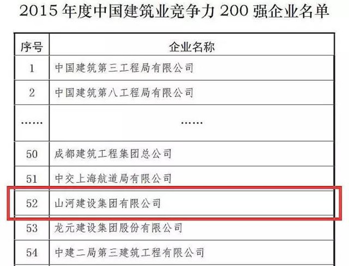 12月8日,中建协在广西南宁发布2015年度中国建筑业竞争力200强企业,山河集团在榜单中排名52位。
