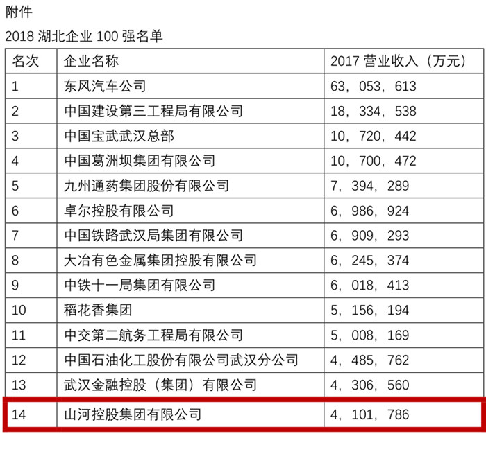 山河控股集团荣登湖北百强企业榜 排名14再升两位