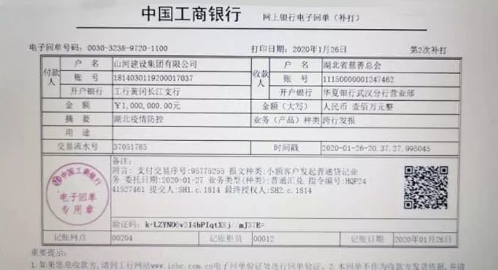 1月26日,山河集团通过湖北省慈善总会捐赠100万元人民币,全力支持黄冈地区的疫情防控工作。根据疫区前线的需求,用于采购防护服、口罩、消毒液等医疗防护用品,为医务人员提供帮助和支持。