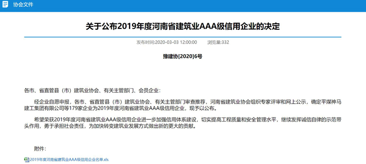 为进一步加强建筑企业信用体系建设,3月3日,河南省建筑业协会发布了《关于公布2019年度河南省建筑业AAA级信用企业的决定》,山河集团河南公司榜上有名,这也是河南公司首次上榜。