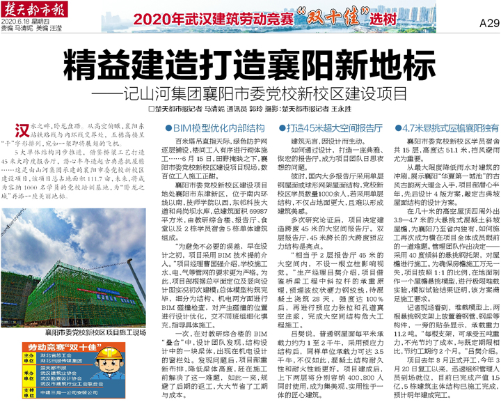 5大单体结构同步推进,借鉴桥梁工艺打造45米大跨度报告厅,潜心半年造起古典悬挑屋檐……这是由山河集团承建的襄阳市委党校新校区建设项目,该项目总占地面积111.7亩,未来,将成为容纳1000名学员的党校培训基地,为“卧龙之城”再添一座美丽地标。