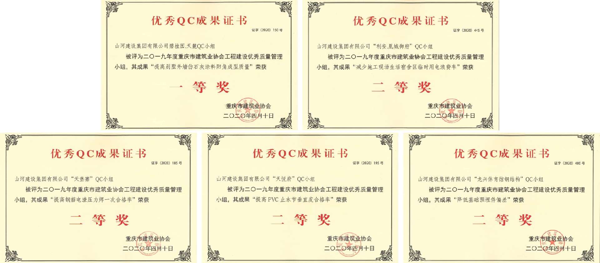 从重庆市建筑业协会获悉,在2019年度工程建设优秀质量管理小组评审活动中,山河建设集团西南公司5项QC成果被评为优秀QC成果,其中一等奖1项、二等奖4项。