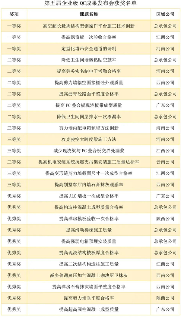 经过评审组专家点评、打分等环节,共评出企业级QC成果一等奖3项、二等奖6项、三等奖6项、优秀奖11项,山河杯银奖1项、铜奖3项,标杆工程一等奖1项、二等奖2项、三等奖2项,智慧工地一等奖1项、二等奖2项、三等奖3项。