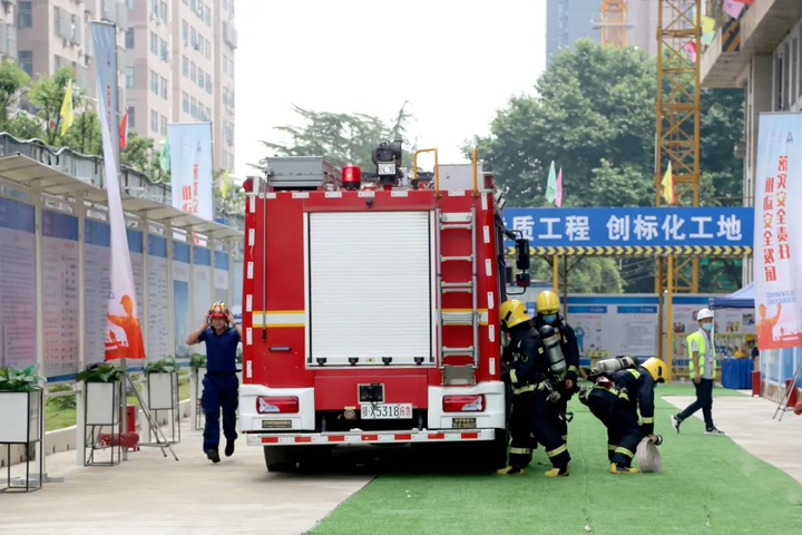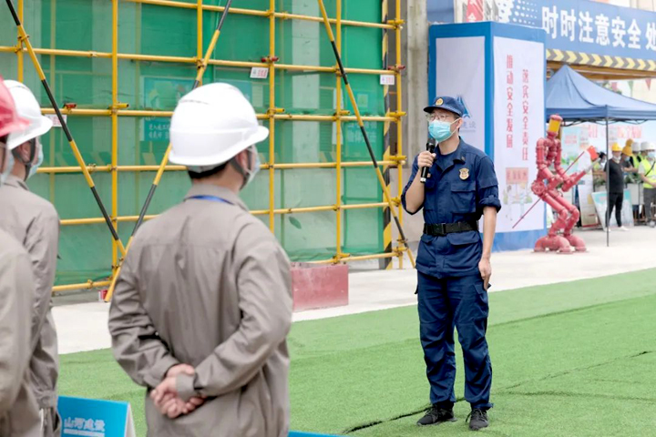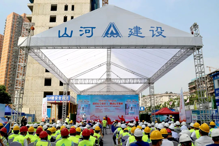 6月2日,武汉市洪山区2021年“安全生产月”启动仪式暨建筑施工应急救援演练活动在山河建设集团总承包公司承建的朗诗·熙华府项目施工现场举行。洪山区政府党组成员牛正可,区应急管理局局长金昆玲,区建设局、消防救援大队、和平街道办事处、建筑管理站等单位领导出席启动仪式,区发改局、城管执法局、卫生健康局、科技和经信局、商务局等近60家单位代表,建设单位、监理单位代表,总承包公司工程团队及在建项目代表等300余人参加了活动。洪山区建管站站长钱伟主持启动仪式。