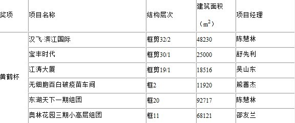 近日,武汉建筑业协会公布了武汉市房屋建筑工程黄鹤奖2006年度获奖项目名单,经武汉市黄鹤奖评审委员会评审、审定,山河建设集团有限公司施工总承包的汉飞・滨江国际、宝丰时代、江涛大厦、无细胞百白破疫苗车间、东湖天下一期、奥林花园三期等6项工程荣获“黄鹤杯”奖。获奖工程详细情况如下: