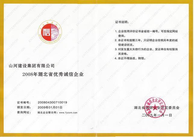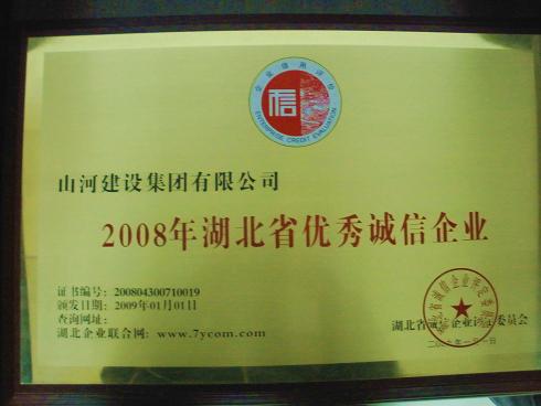 山河集团荣膺2008湖北省优秀诚信企业荣誉